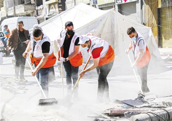 5月23日,巴勒斯坦志愿者在加沙城一处遭到以色列轰炸的地点清理废墟。