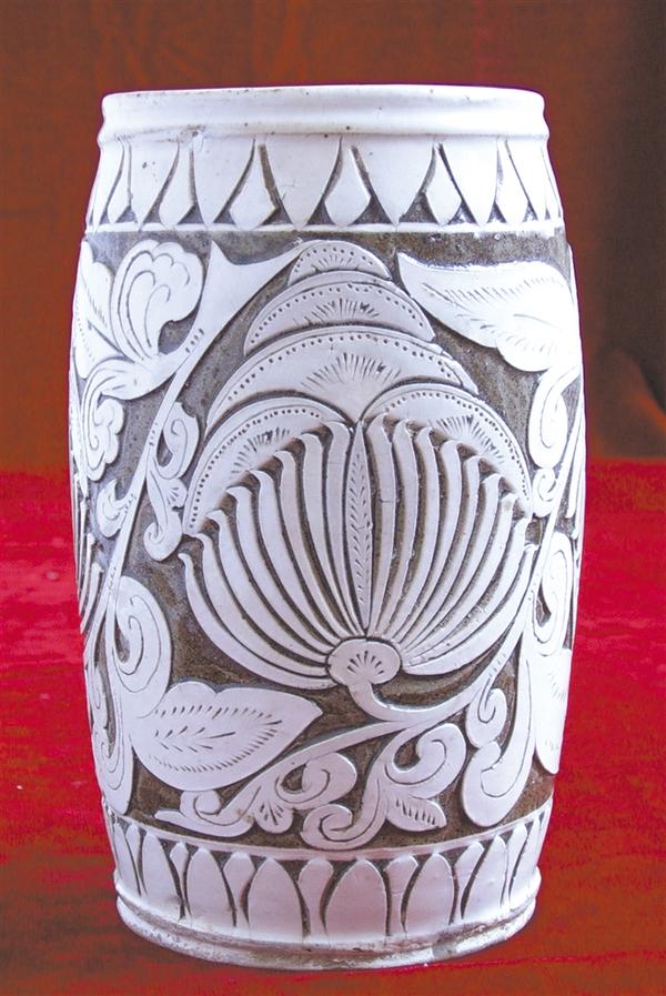 在周口市博物馆陈列着一件宋代登封窑白釉刻花罐(如图),分外引人注目:唇口,筒形腹,腹部稍广,圈足,口底大小相同,瓶身环绕着神秘花纹。