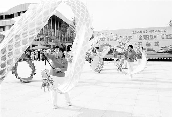 5月25日上午,2021年郸城县“全民健身月”活动暨第十三届职工运动会开幕式在该县体育馆举行,倡导全县广大群众迅速行动,积极投身全民健身活动,为建设“健康郸城”、促进郸城经济社会发展作出积极贡献。本届运动会共有32支代表队810余名选手参加。图为开幕式上,该县空竹协会的队员正在表演节目。