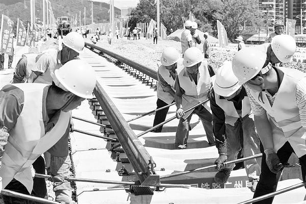 5月27日,中铁四局施工人员在深圳北站外铺设赣深铁路广东段南端大里程方向最后一对长轨。当日,随着中铁四局铺轨机组将一对长轨与深圳北站线路南段成功对接,赣深高铁广东段南端大里程方向正线铺轨全部完成。