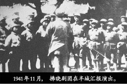 1938年深秋,剧团到泌阳县邓庄铺演出,群众自动地找木棍、找门板、挖土埋柱子,很快搭起一座戏台,挂上幕布,点燃油灯,男女老少坐在戏台前的空地上。戏台上先是演员们合唱抗日歌曲《新四军军歌》《游击队歌》《到敌人后方去》等,后演出话剧《突击》。当剧中的老爷爷抱着被日寇杀死的孩子,含泪控诉敌人的暴行时,台下的观众禁不住地愤怒高呼:“打倒日本帝国主义!把日本鬼子赶出中国!”1939年11月初,徐海东随刘少奇由竹沟到华中路过新兴集,彭雪枫命拂晓剧团组织一个晚会,以示热烈欢迎。拂晓剧团接受任务后,大家争分夺秒,只用了一天时间,就集体创作排练出京剧《徐海东粉碎日寇“扫荡”》,第二天就在欢迎晚会上演出。
