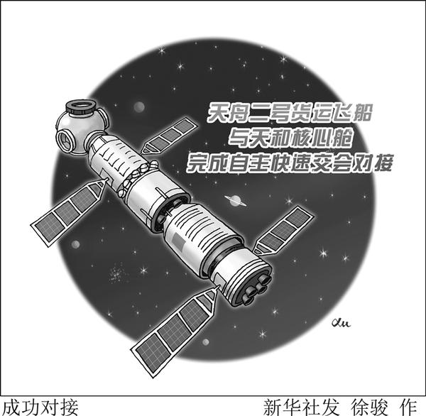 据中国载人航天工程办公室消息,天舟二号货运飞船入轨后顺利完成入轨状态设置,于5月30日5时01分,采用自主快速交会对接模式,精准对接于天和核心舱后向端口,整个过程历时约8小时。新华社发 徐骏 作