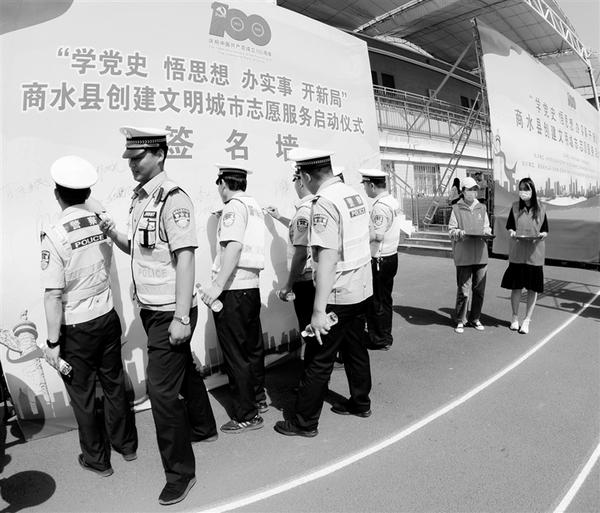 5月28日,商水县公安交警大队紧盯民心所想,深入推进“我为群众办实事”实践活动,给群众出行创造平安、和谐、有序的交通环境。图为交警志愿者在该县“学党史、悟思想、办实事、开新局”创建文明城市志愿服务启动仪式上签名。 记者 付永奇 通讯员 郭利军 摄