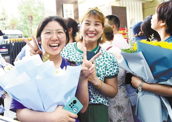 6月8日,在河南省郑州市为民高中考点,考生和家长一起庆祝。当日,全国部分地区2021年高考结束。
