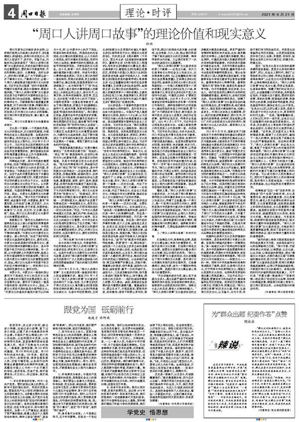 “周口人讲周口故事”文化宣讲活动的第二个篇章——红色文化篇,则大力弘扬革命文化和社会主义先进文化,比如李庚香主讲的《以正能量推动周口经济社会发展高质量》,王保清主讲的《杜岗会师》,赵振然主讲的《从周口走出的英雄部队——中国人民解放军第十八军的故事》,王爱民主讲的《红色三川地,英雄周家口》,郑吉安主讲的《共产党人的信仰与忠诚》,叶建民主讲的《“雪枫支队”在鹿邑》等。2020年8月12日,河南省委组织部常务副部长苏长青一行到周口市淮阳区,调研指导新时代文明实践中心建设和脱贫攻坚工作时强调,要“引导广大干群自发学习党史、新中国史、改革开放史、社会主义发展史,讲述好红色故事,宣传好红色历史,传承好红色基因”。2021年2月1日下午,习近平总书记同各民主党派中央、全国工商联负责人和无党派人士代表欢聚一堂,共迎佳节。习近平总书记指出,中共中央决定,2021年在全党开展中共党史学习教育,激励全党不忘初心、牢记使命,在新时代不断加强党的建设。全党同志要做到学史明理、学史增信、学史崇德、学史力行,学党史、悟思想、办实事、开新局,以昂扬姿态奋力开启全面建设社会主义现代化国家新征程,以优异成绩迎接建党一百周年。在全党正在集中开展党史学习教育,庆祝党的百年华诞的重大时刻,在“两个一百年”奋斗目标历史交汇的关键节点,“周口人讲周口故事”之红色文化篇的开讲,可谓正当其时,目的就是讲述好周口的红色故事,宣传好周口的红色历史,让周口广大人民群众传承好红色基因,以昂扬姿态奋力谱写全面建设社会主义现代化新周口绚丽篇章,因此具有极强的现实意义和教育意义。