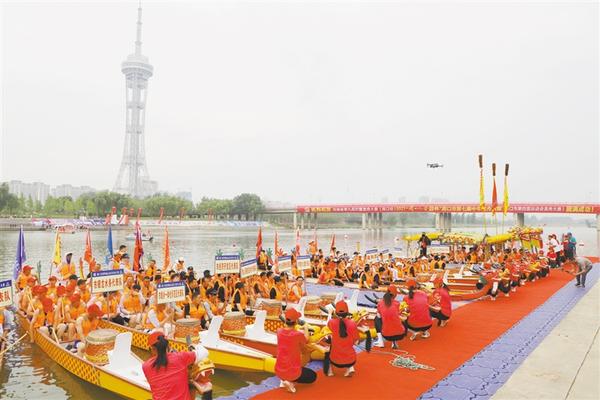 本届龙舟赛以“传承文化,凝聚人心;激情龙舟,活力周口”为主题,吸引了来自各县(市、区)和市直单位组成的19支代表队、300多名队员参赛,比赛项目分为200米直道竞速和500米直道竞速。记者 窦娜 通讯员 丁玺 摄