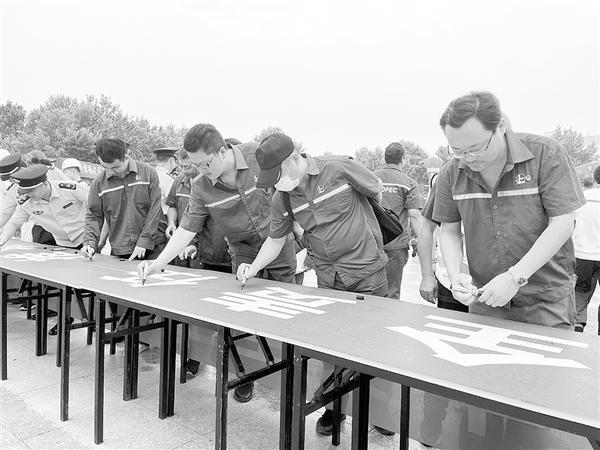 6月25日,我市在川汇区广场举行了以“落实安全责任 推动安全发展”为主题的2021年“安全生产月”宣传咨询日活动。图为中国石化周口石油分公司员工参加万人签名仪式。通讯员 孙晨豪 摄