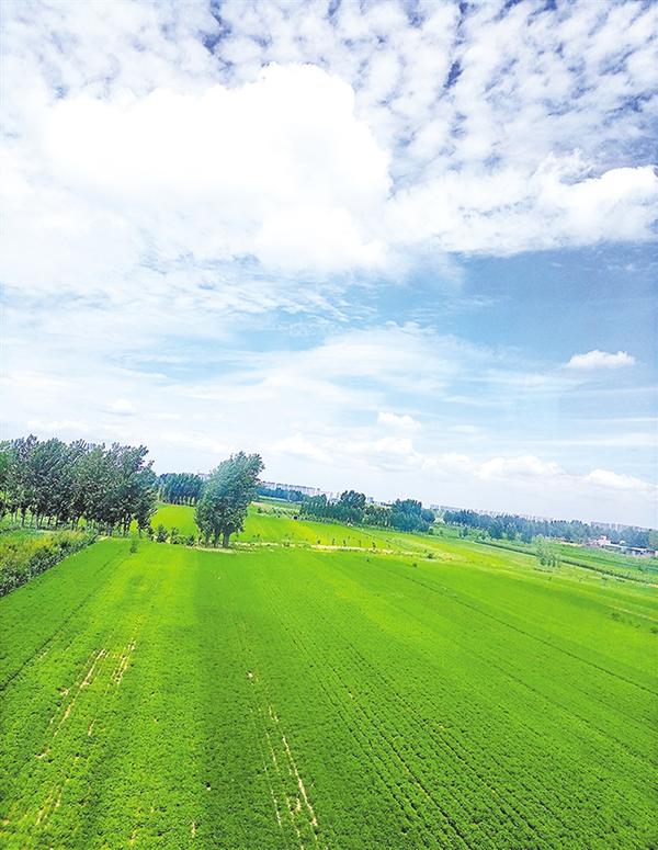 7月5日,记者从周口东站乘坐高铁途经扶沟站时,被窗外的美丽风景所吸引:蔚蓝的苍穹上,像棉花似的白云悠闲地散着步,俯瞰着绿意盎然的三川大地。这样一幅天蓝地绿云悠远的绝美风景令人心旷神怡。 记者 宋海转 摄