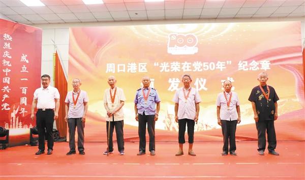 本报讯 (记者 宋风 文/图) “‘共产党员’是我心中最高的荣誉,感谢党组织对老党员的关心,让我们感受到作为共产党员的无上光荣!”6月26日,在周口港区“光荣在党50年”纪念章颁发仪式上,李埠口乡老党员王同礼接过纪念章后心潮澎湃。