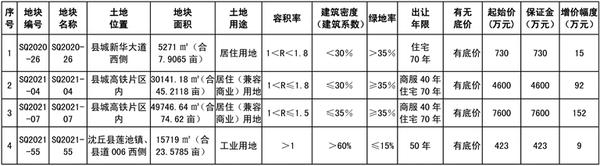 备注:SQ2020-26号:1.宗地“五通一平”(宗地外通路、通电、通讯、通上水、通下水,宗地内土地平整);2.由辖区政府负责按时向受让人交付土地。 SQ2021-04号:1.宗地“三通一平”(宗地外通路、通电、通水,宗地内土地平整);2.建筑高度≤36米;3.商业建筑面积占宗地地上总面积的比例<5%;4.停车泊位指标:机动车:住宅≥1.2个/户;5.由辖区政府负责按时向受让人交付土地。SQ2021-07号:1.宗地“三通一平”(宗地外通路、通电、通水,宗地内土地平整);2.建筑高度≤24米;3.商业建筑面积占宗地地上总面积的比例<5%;4.停车泊位指标:机动车:住宅≥1.2个/户;5.由辖区政府负责按时向受让人交付土地。SQ2021-55号:1.宗地“三通一平”(宗地外通路、通电、通讯,宗地内土地平整);2.由辖区政府负责按时向受让人交付土地;3.行政办公及生活服务设施用地面积不得超过工业项目总面积的5%;4.宗地距东侧道路中心不少于20米;5.准入行业:金属制品业。