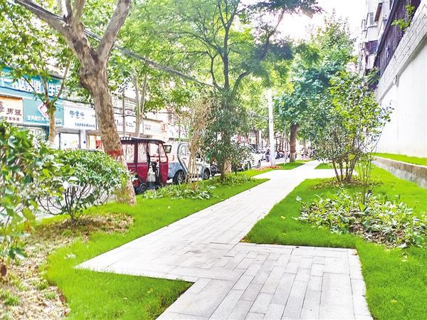 7月8日,在周口市六一路小学大门口附近,一个布满绿地、景观树、花草的小型街头游园亮相育新街道路边。市民在闲暇之余,可以选择坐在树荫下的凳子上休息娱乐,给人带来别样的享受。 记者 张洪涛 摄