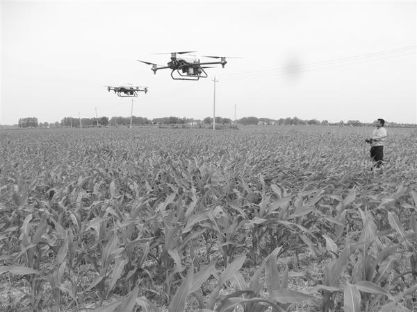 7月10日,沈丘县周营镇一处万亩订单优质高产玉米种植基地,飞防职业技术“蓝领”在操作两架无人机防治玉米病虫害。