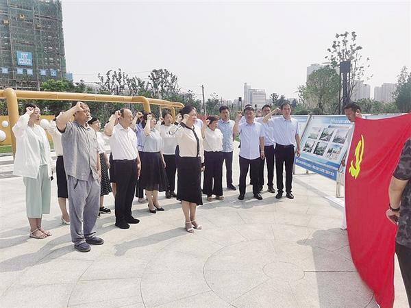 当日,该局全体党员干部实地观摩了中心城区贾鲁河西岸、鱼翔湖、周口植物园、永宁湖等水系治理改造项目,并在沙颍河治理工程二期太极广场,面向党旗,重温了入党誓词(如图)。