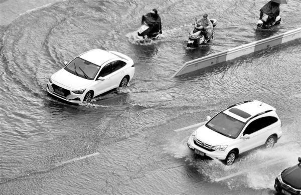 7月20日,车辆在郑州市花园路涉水前行。