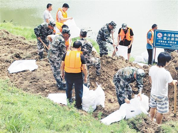 图一 连日来,扶沟县广大党员干部始终冲锋在第一线、战斗在最前沿,把防汛救灾作为当前首要政治任务,迅速贯彻落实上级决策部署,采取多种措施,最大限度减少灾害损失。图为党员干部正在加固堤防。 记者 金月全 摄