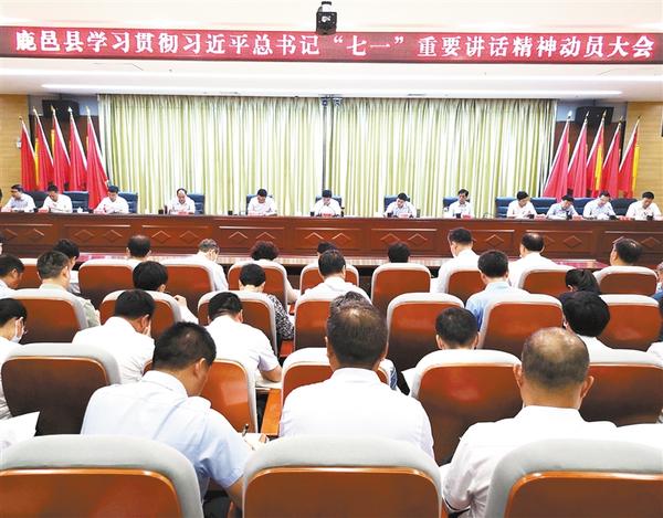 本报讯 (记者 李瑞才 文/图) 7月17日,鹿邑县学习贯彻习近平总书记“七一”重要讲话精神动员大会召开(如图),对习近平总书记“七一”重要讲话精神再学习、再巩固。县委书记李刚出席会议并讲话。县委副书记、县长郭俊涛主持会议。许四军、李国际、雷申、宋涛、杨所超、侯自峰、张国庆、袁航、金溪、程卫东等县四个班子领导出席会议。
