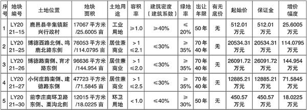 挂牌报价时间为:LY2021-15地块:2021年8月10日9时至2021年8月20日15时;LY2021-25地块:2021年8月10日9时至2021年8月20日15时10分;LY2021-26地块:2021年8月10日9时至2021年8月20日15时20分;LY2021-27地块:2021年8月10日9时至2021年8月20日15时30分;LY2021-30地块:2021年8月10日9时至2021年8月20日15时40分。挂牌网址:鹿邑县公共资源交易平台(http://www.lyggzyjy.org.cn/)。