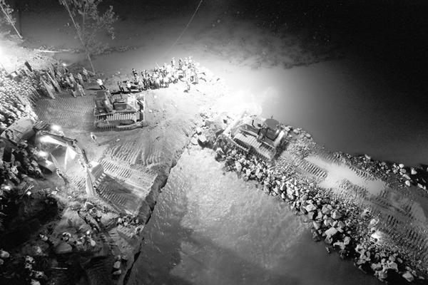 还剩5米、4米……连续奋战20多个小时,眼看就要合龙,对岸再次发生垮塌,已经缩小的龙口再次被强劲的水流冲开,刚卸载的填满石块的钢筋笼,一入水就被冲刷到几米外。