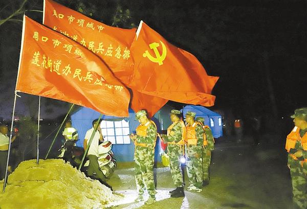 特大洪峰的到来是对沿河两岸的严峻考验,为确保安全度汛和沿河人民群众生命财产的安全,7月21日当晚,项城市人武部立即组织由党员先锋参加的“抗洪抢险民兵党员突击队”120人,对沙颍河沿岸进行布控,一是配合该市防汛抢险指挥部监控水情;二是劝阻在近水捞鱼群众迅速远离;三是疏通沿河公路,保障后续抗洪抢险车辆物资能够畅通到达。