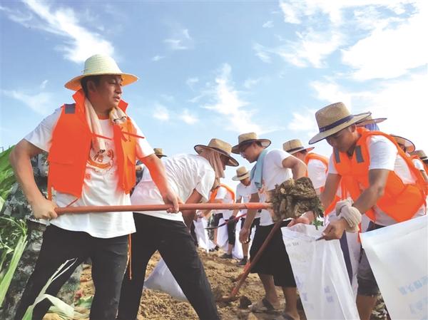 连日来,在西华县贾鲁河聂堆镇鲤鱼滩险工段,广大党员干部群众不分昼夜,始终坚守在河堤一线,固堤排险。 记者 张猛 张志新 摄