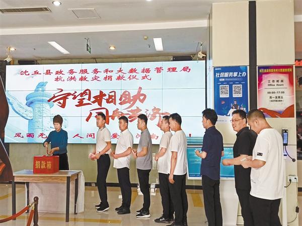 上个月,我省遭遇强降水袭击,多地发生暴雨洪涝。其中,省会郑州市的情况尤为严重,灾情牵动着沈丘县政数局全体职工的心。“一方有难,八方支援”,该局在县政务服务中心组织开展“守望相助 同舟共济”抗洪救灾捐款活动,全体干部职工、窗口工作人员与办事群众捐款共计10600元。目前,捐款已通过各种渠道送达灾区。记者 韦伟 摄