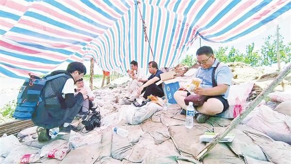 汛情当前,不辞劳苦。7月26日,在西华县聂堆镇贾鲁河鲤鱼滩险工段的采访令张猛印象深刻。张猛说:“那天骄阳似火,地面温度得有40多摄氏度,周口日报10名全媒体记者,在防汛救灾一线,连续采访、直播了6个多小时,饿了就吃口面包,渴了就喝口矿泉水。等采访结束,我才发现大家的肤色都变了个样。”