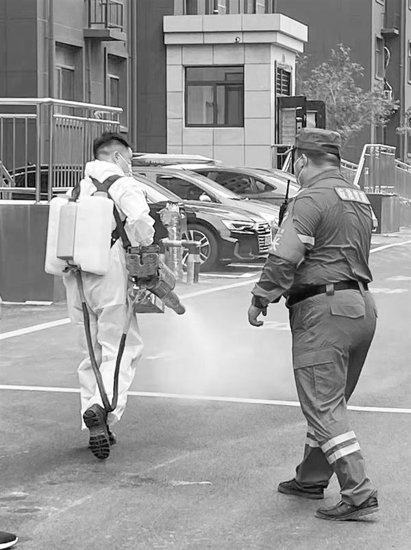 身穿蓝色防护服、背着喷雾器、手持喷雾枪,队员刘勤工和程璐全副武装,一丝不苟地对大门口、公共场所、楼道口、垃圾箱等位置进行消毒。高温下,密不透风的防护服10分钟就会让人全身湿透。在疫情面前,他们被群众称为“消杀战士”。
