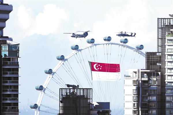 8月9日,悬挂新加坡国旗的直升机在新加坡参加国庆庆典检阅礼。新加坡9日举行国庆庆典检阅礼,庆祝独立56周年。新华社发