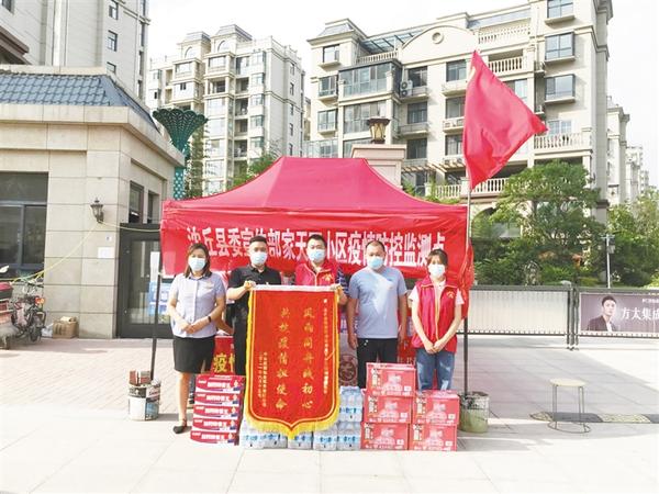 图二为县委宣传部工作人员连续多天在中瑞家天下小区门口设立疫情防控监督台,不间断播放广播录音,提醒小区居民做好防范,戴口罩、不聚集,做好居家隔离,形成人人参与抗疫的良好氛围,小区物业为值班人员送去物资及锦旗表示感谢。