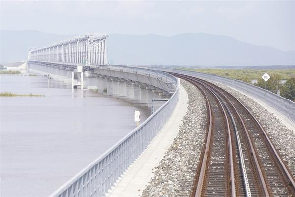 8月17日,同江中俄黑龙江铁路大桥实现铺轨贯通。当日,在同江中俄黑龙江铁路大桥施工现场,中俄两国准轨接口最后一组轨道夹板安装完成,标志着中俄两国首座跨江铁路大桥——同江中俄黑龙江铁路大桥实现铺轨贯通,为大桥全线开通运营奠定了坚实基础。 新华社记者 张涛 摄