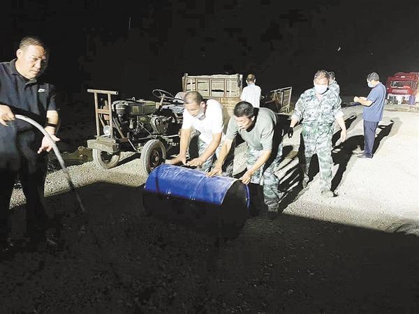 图三:由于作业现场道路狭窄,救援队员只能将油桶推至排涝设备旁加油。