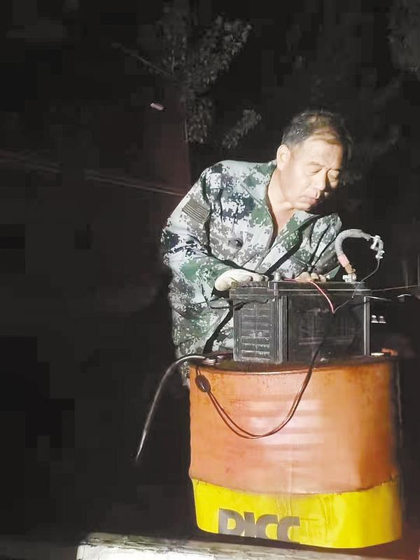 图一:救援队中年近60岁的老大哥栾永锋连续奋战三昼夜,凌晨4点,栾永锋还在为排涝设备加油。