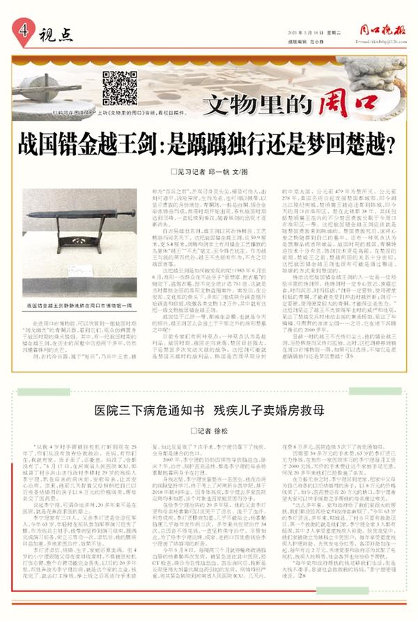 这个系列的每一篇文字稿件,记者写过之后,我都会看看、改改,怕有专业上的失误,还会让周馆长再把关,可以说,他给我们提供了最专业的支持。每一次,他都会改动几处,有时是文中的失误,有时为了一个器物的称谓更简洁而准确,有时是为了描述的词语更准确、更贴切……比如,写越王剑时,他建议用“战国错金越王剑”,他认为每件器物上加上时代更规范,也会更有吸引力。写宋代白釉剔刻花瓷罐时,他建议去掉“剔”和“瓷”字,这样读起来更简洁、语感更好一些等等。