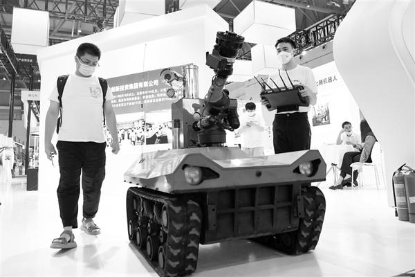 图② 工作人员(右)在2021智博会上展示“消防灭火侦察机器人”。