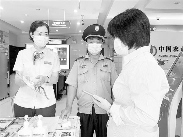 ②近日,农行周口分行疫情防控和防电诈宣传两手抓,各营业网点加强通风设施和消毒设备的配备管理,每天定时进行消毒,发放反电诈宣传折页。图为8月25日,农行八一路支行大堂工作人员正在向客户讲解防骗知识。