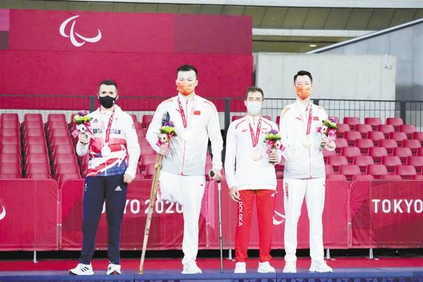 乒乓球——闫硕获得男子单打7级金牌 8月29日,闫硕(左二)在颁奖仪式上。当日,在东京残奥会乒乓球男子单打7级决赛中,中国选手闫硕战胜英国选手威廉·贝利,夺得金牌。