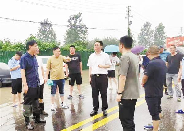 本报讯 (记者 张劲松 任富强 文/图) 9月4日,市人大常委会副主任、示范区党工委书记闫立超深入一线察看水情,要求切实做好队伍组织、物资储备、配合互助等防汛各项工作,并现场紧急指挥全区排涝救灾。区管委会副主任张晓参加活动。