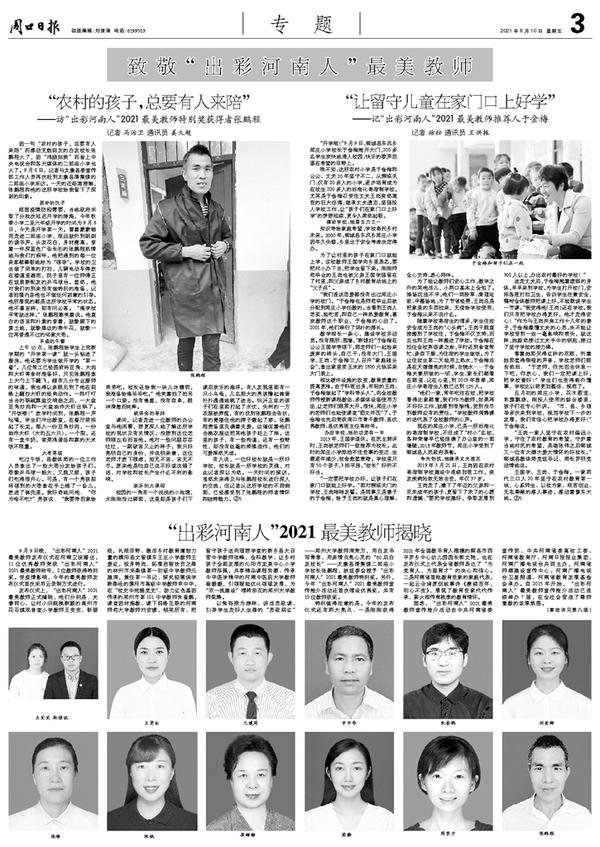 以焦裕禄为榜样、讲活思政课、引导学生走好人生路的“思政网红”——郑州大学教师周荣方,用白发书写青春、用亲情点亮心灵的“80后白发校长”——太康县清集镇二郎庙小学校长张鹏程,被组委会授予“出彩河南人”2021最美教师特别奖。另外,今年“出彩河南人”2021最美教师宣传推介活动还首次增设优秀奖,共有10位教师获奖。