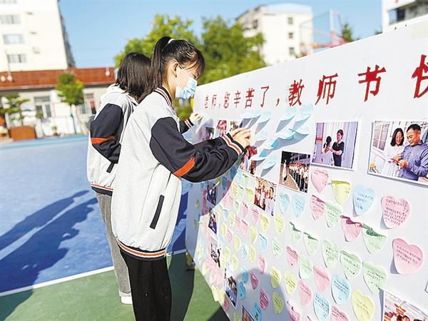 昨天是第37个教师节,我市广大中小学生以多种形式举行庆祝活动,向教师表达崇高的敬意。图为周口十八中学生通过制作心愿卡的形式,给老师们送上最纯真而诚挚的祝福。