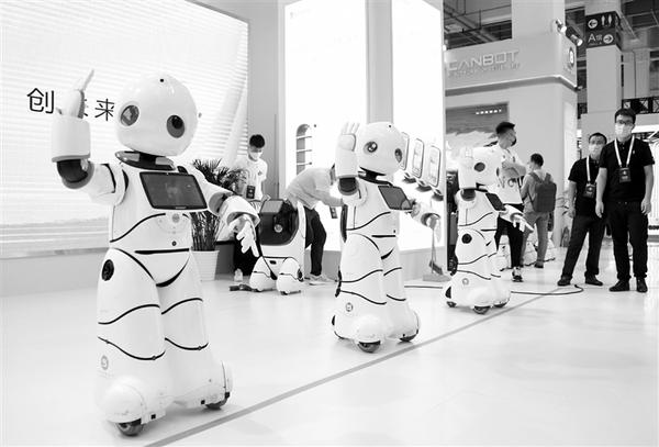 9月10日,在2021世界机器人博览会现场,服务机器人在跳舞。 当日,2021世界机器人大会在北京开幕,本次大会的主题为“共享新成果,共注新动能”,包含论坛、博览会、机器人大赛等内容。新华社记者 任超 摄