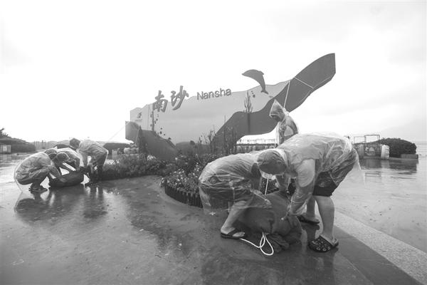 9月14日,党员志愿者在舟山朱家尖南沙景区内用沙袋加固景区主题墙。当日,随着台风影响逐渐减弱,浙江舟山各街道乡镇的党员志愿者积极参与排涝除险、交通疏导、清理垃圾等工作,将台风带来的影响降到最低,尽快恢复正常的工作生活秩序。新华社记者 徐昱 摄