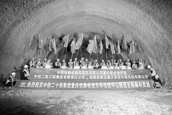 9月14日,建设工人和工作人员在樵坪山隧道贯通面庆祝隧道贯通。当日,由中铁二院勘察设计、中铁二十局承建的樵坪山隧道顺利贯通。该隧道正线上跨渝湘高铁,全长7568米,是重庆铁路枢纽东环线最长的双线隧道。新华社记者 唐奕 摄