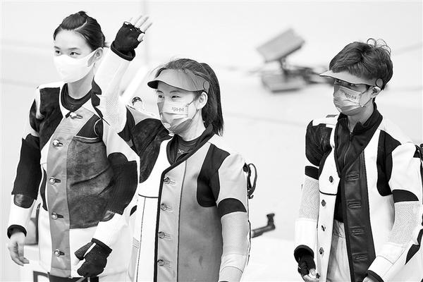 9月15日,山西队选手苗婉茹(中)夺冠后致意。当日,在西安举行的第十四届全运会射击女子50米步枪3种姿势决赛中,山西队选手苗婉茹以总成绩466.9环获得金牌。