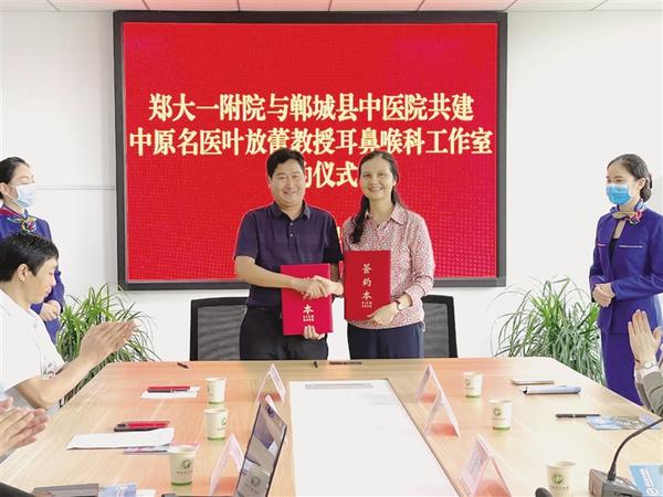 本报讯(记者 徐松 通讯员 张洋 文/图)9月18日上午,郑大一附院与郸城县中医院共建中原名医叶放蕾耳鼻喉科工作室签约仪式在郸城县第二医疗健康服务集团县中医院行政楼四楼会议室举行(如图)。中原名医叶放蕾教授专家团队,县卫健委党组成员、副主任徐涛,县卫健委副主任科员李梦,郸城县第二医健集团总医院院长水新华、副院长杨俊出席仪式,郸城县中医院相关科室负责人参加仪式。仪式由李梦主持。