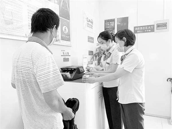 ② 今年以来,农行周口分行不断完善服务功能,提高服务品质,增强网点服务能力,网点全面加速智能化升级,节省客户等待时间,为客户提供便民贴心服务。图为农行周口分行火车站分理处为客户清点现金。