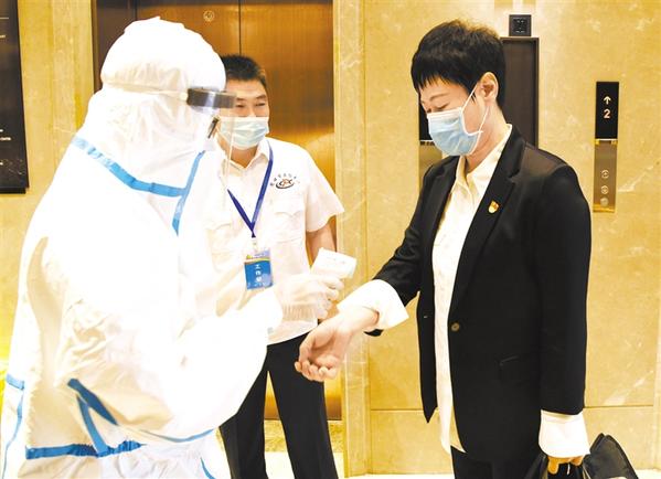 9月26日上午,参加中国共产党周口市第五次代表大会的代表们精神饱满、信心满怀,肩负着全市党员干部的重托,满载着全市人民的期盼,向大会报到。在未来3天里,他们将认真履行党代表职责,共商周口发展大计。图为疫情防控人员为报到的代表测量体温。 记者 孙安平 摄