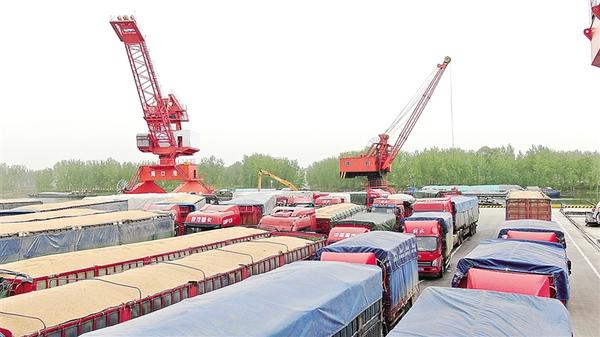 码头工作人员介绍,水运具有运能大、运价低、污染小、占地少的优势,特别适合大宗货物长距离运输。据测算,大宗商品通过公路运输每吨每公里运费为5角钱,铁路每吨每公里为2角钱,而走水路每吨每公里只需要5分钱。目前,周口中心港码头单船最大载重可达2600吨,运力相当于43节火车车厢或65辆大货车。周口港区凭借特有的水运优势,对周边地区形成了巨大的虹吸效应,引来大量粮食、化工原料、钢铁、建材等大宗商品在周口中心港码头集聚,装船后发往全国各地。与此同时,来自加拿大的小麦、澳大利亚的大麦、巴西的大豆、东南亚的红木、马来西亚的布敦岩、印度尼西亚的镍矿石等商品,从周口中心港上岸,转运至目的地。