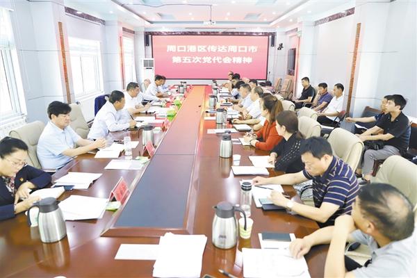 本报讯 (记者 宋风 文/图) 9月30日,周口港区党委书记孙鹏主持召开党委扩大会,传达市五次党代会精神,对全区深入学习宣传贯彻落实党代会精神进行部署(如图)。港区全体领导班子成员、区直单位负责人参加会议。