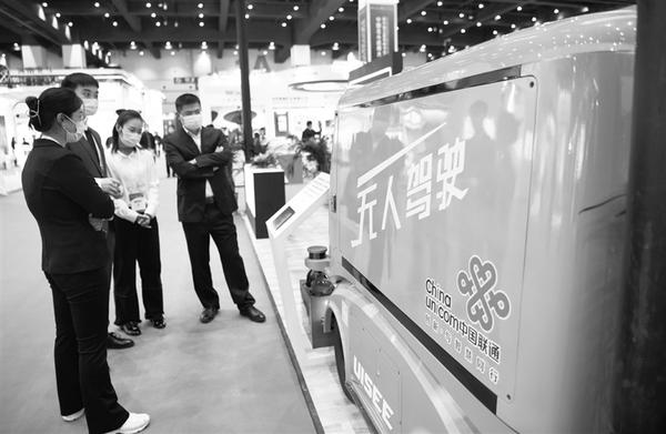 10月10日,观众在北斗融合应用成果博览会上参观一款无人驾驶运输车。