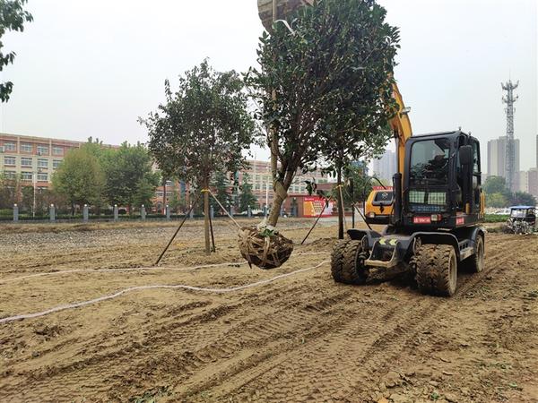 本报讯(记者 郭坤 文/图)10月19日13时许,太昊路与朝阳路交叉口西南角周口技师学院门前,数名园林工人在夹杂着寒气的秋风中与两台钩机配合,忙着栽种绿植(如图)。很快,这里将出现一个一年常青、四季有花的街头游园。